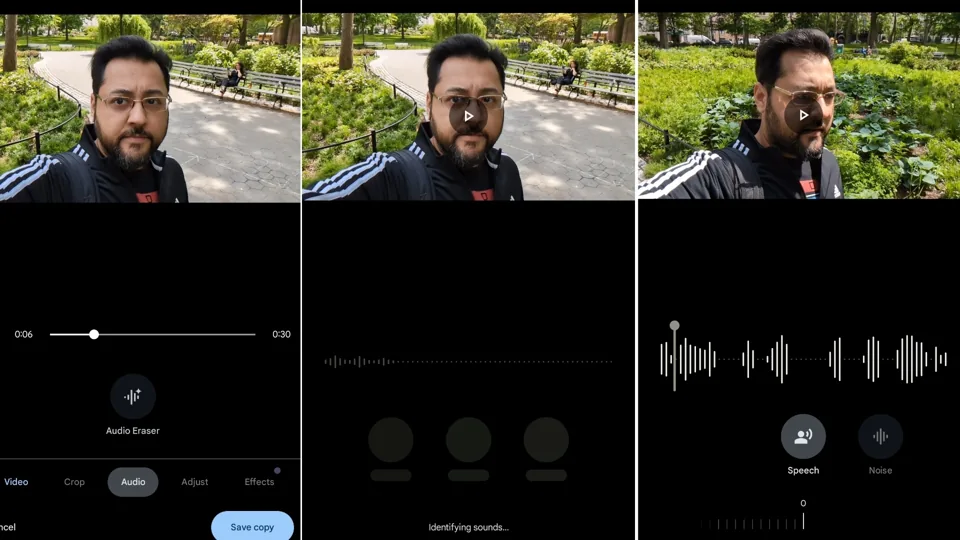 Audio Magic Eraser نیز مانند یک طلسم عمل کرد. من یک ویدیوی آزمایشی در فضای باز گرفتم و توانستم سه منبع را جدا کنم: صدای من، صدای طبیعت و صدای عمومی پس‌زمینه مانند آژیرها. Audio Magic Eraser گاهی اوقات می‌تواند فقط دو عنصر را جدا کند: صداها و صدای پس‌زمینه. ریمیکس کردن صدا برای تقویت صدای من و کاهش صدای آژیرها بسیار آسان بود.